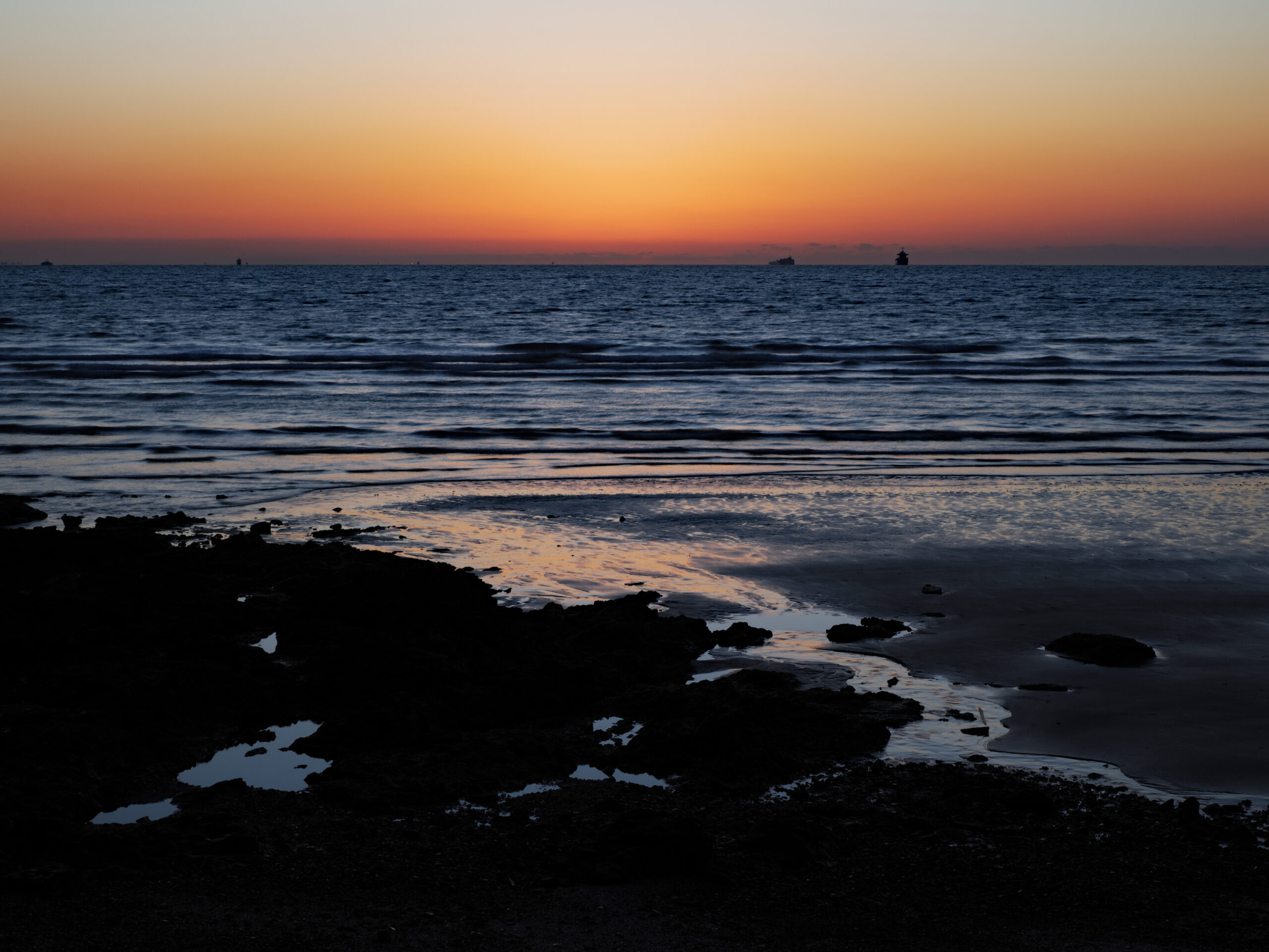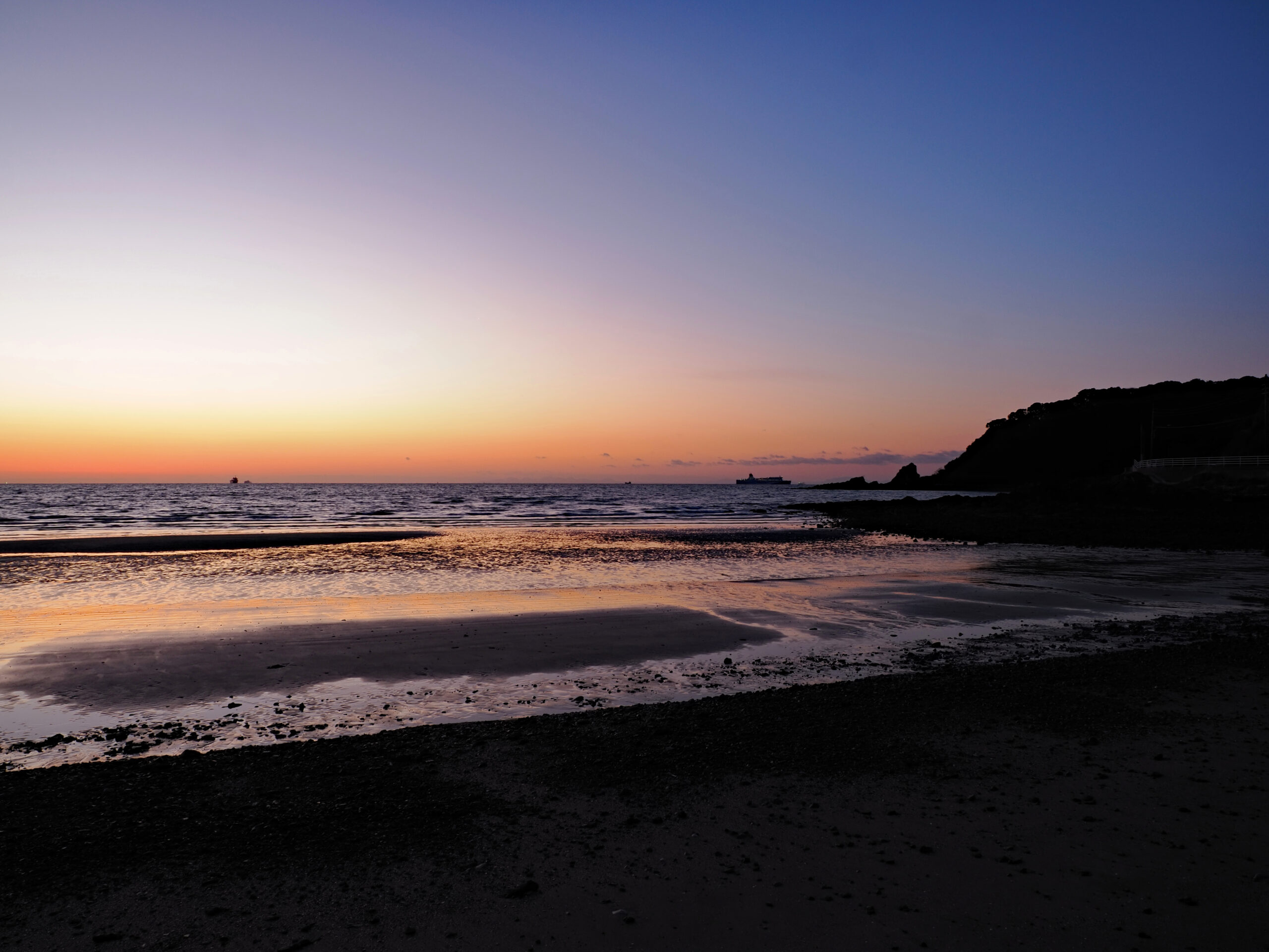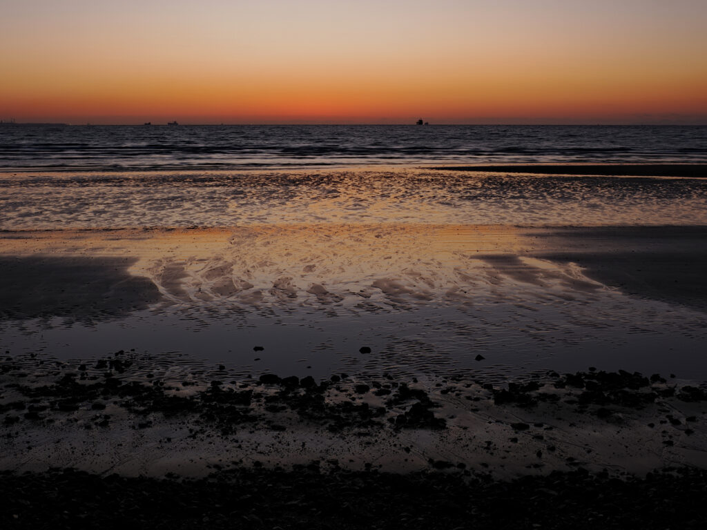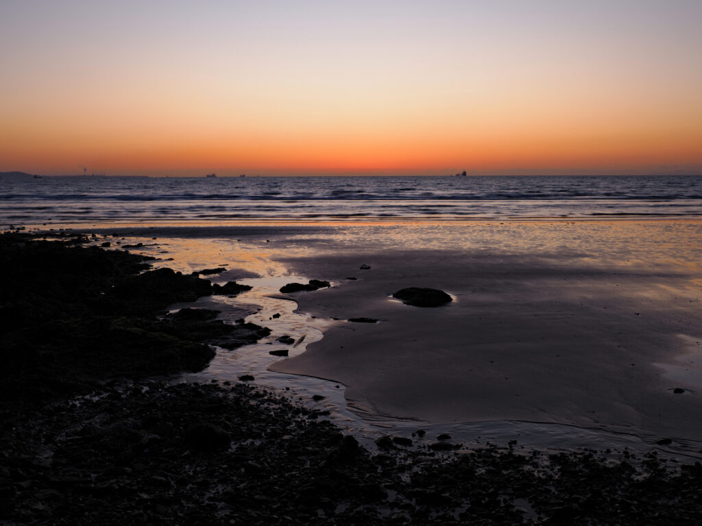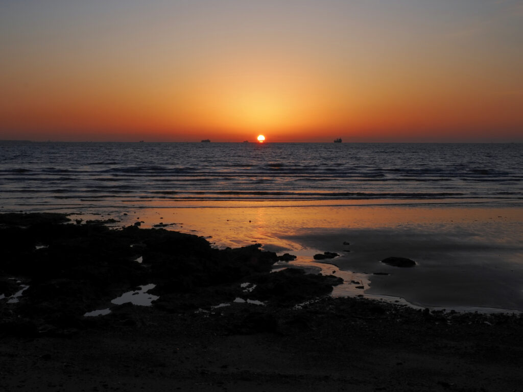 「いさんだの浜」という所なのですが、この日は干潮のタイミングで日の出方向は瀬戸内海、ここからだと陸地ではなく水平線から上がるだろうという予測で選びました。