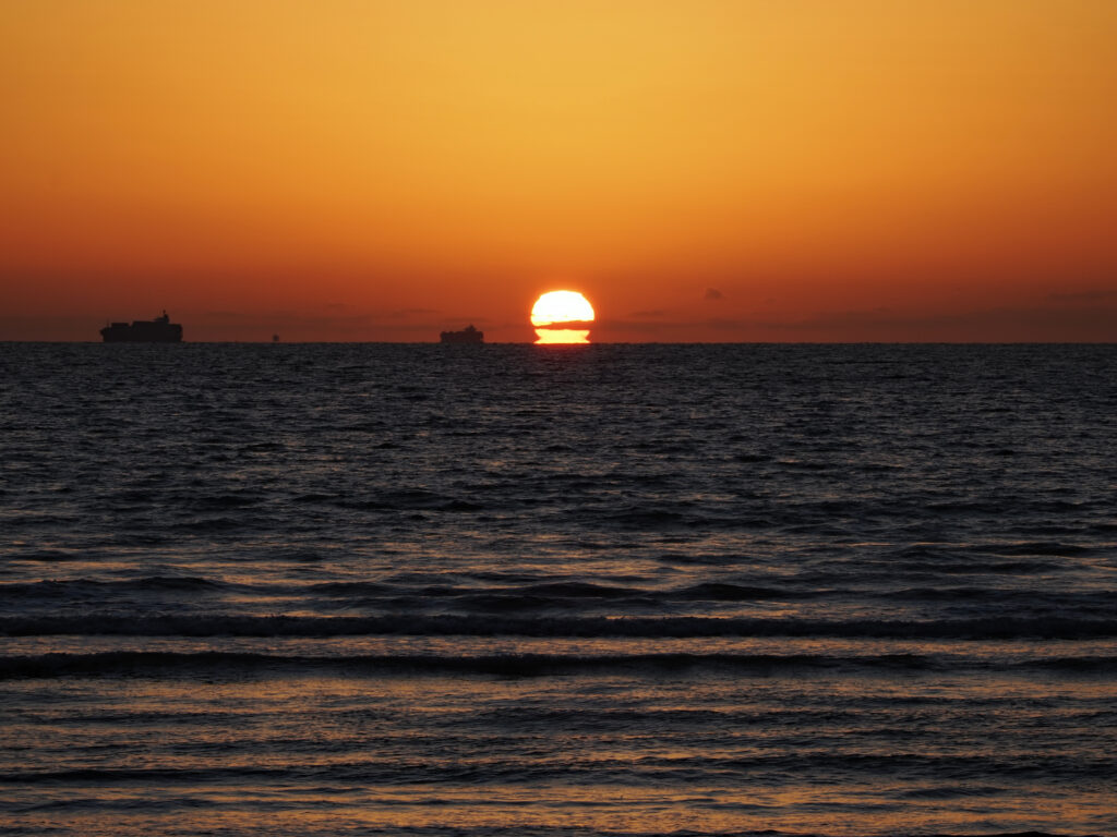 貨物船がちょうど朝日にかかり、急いで三脚を移動・・・なんとかダルマ朝日を見ることが出来ました!!