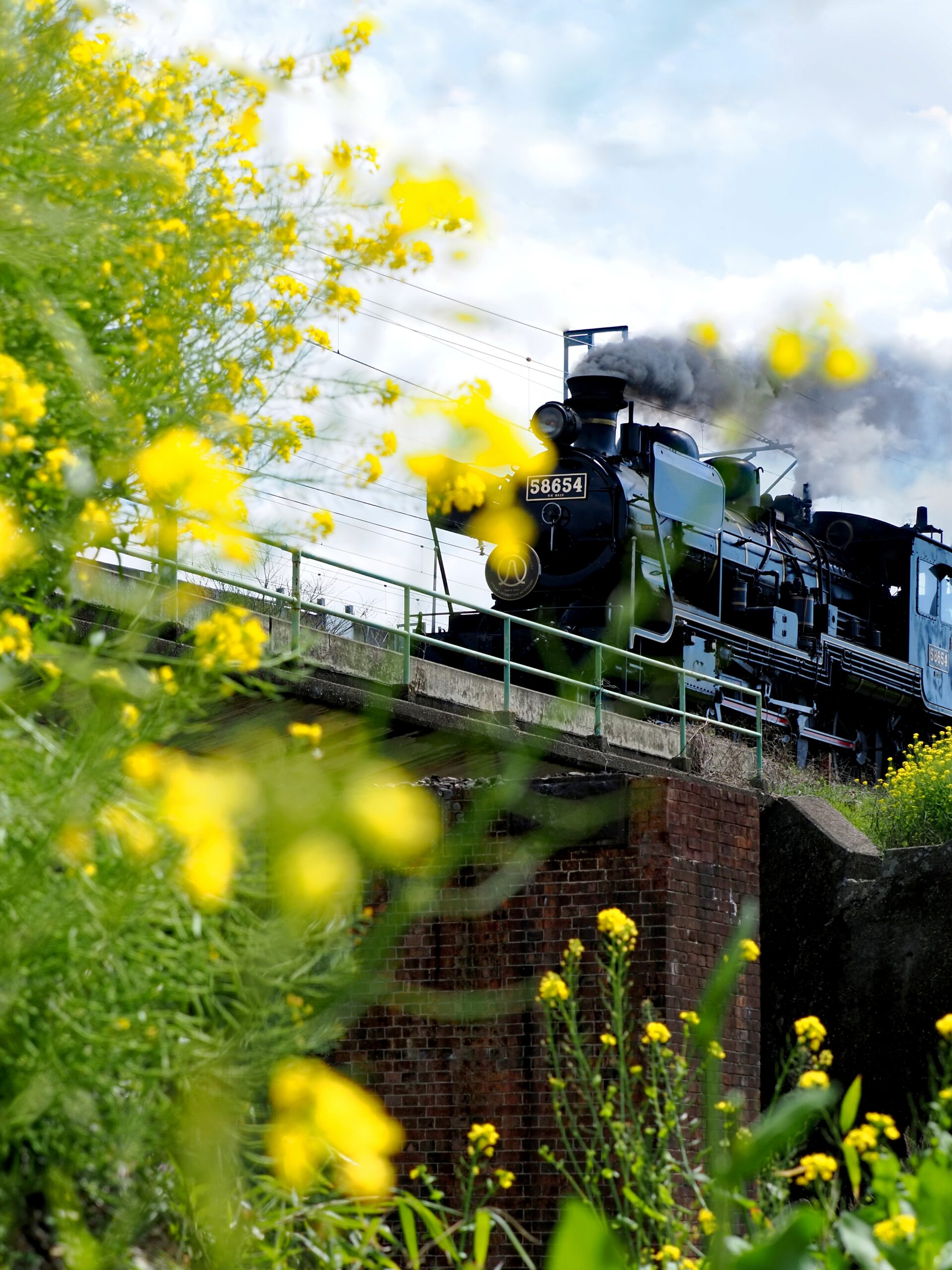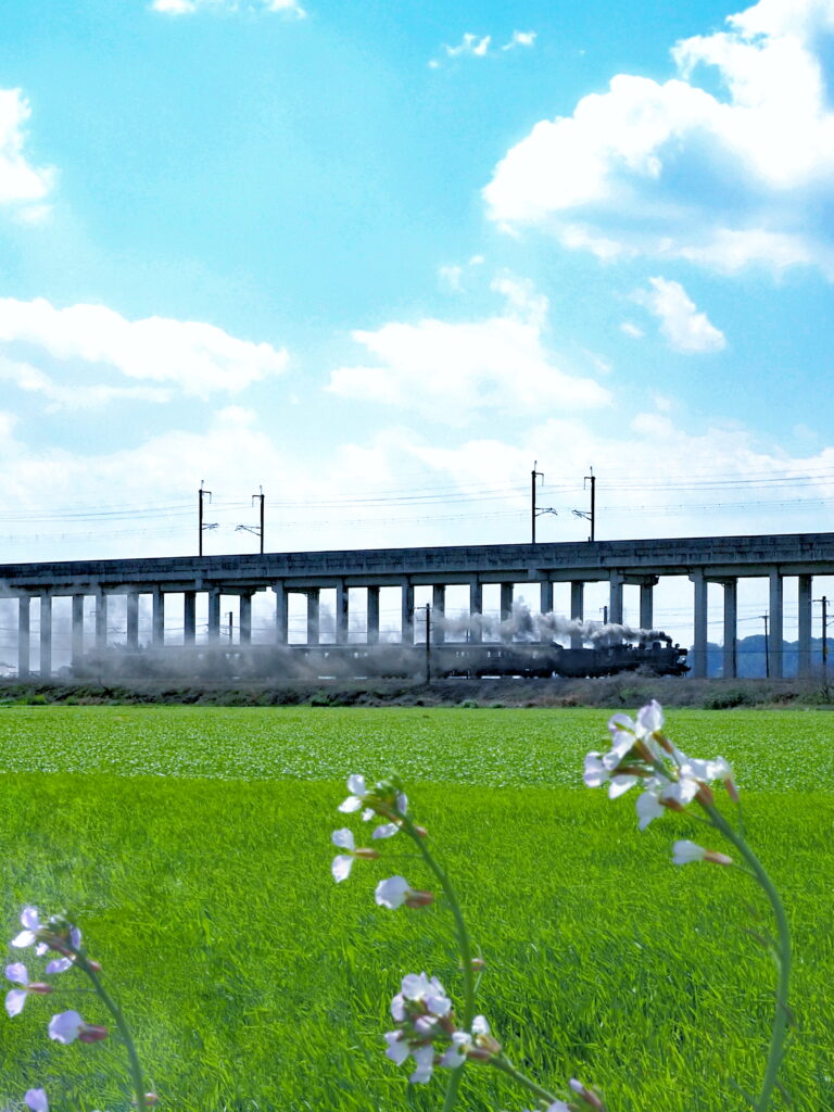 イメージとしては、現代の列車の最上位に君臨する新幹線高架の下をレトロな蒸気機関車が走る・・・といった感じです。菜の花が近くになく、季節感を出すために大根の花?を前景に取り入れてみました。