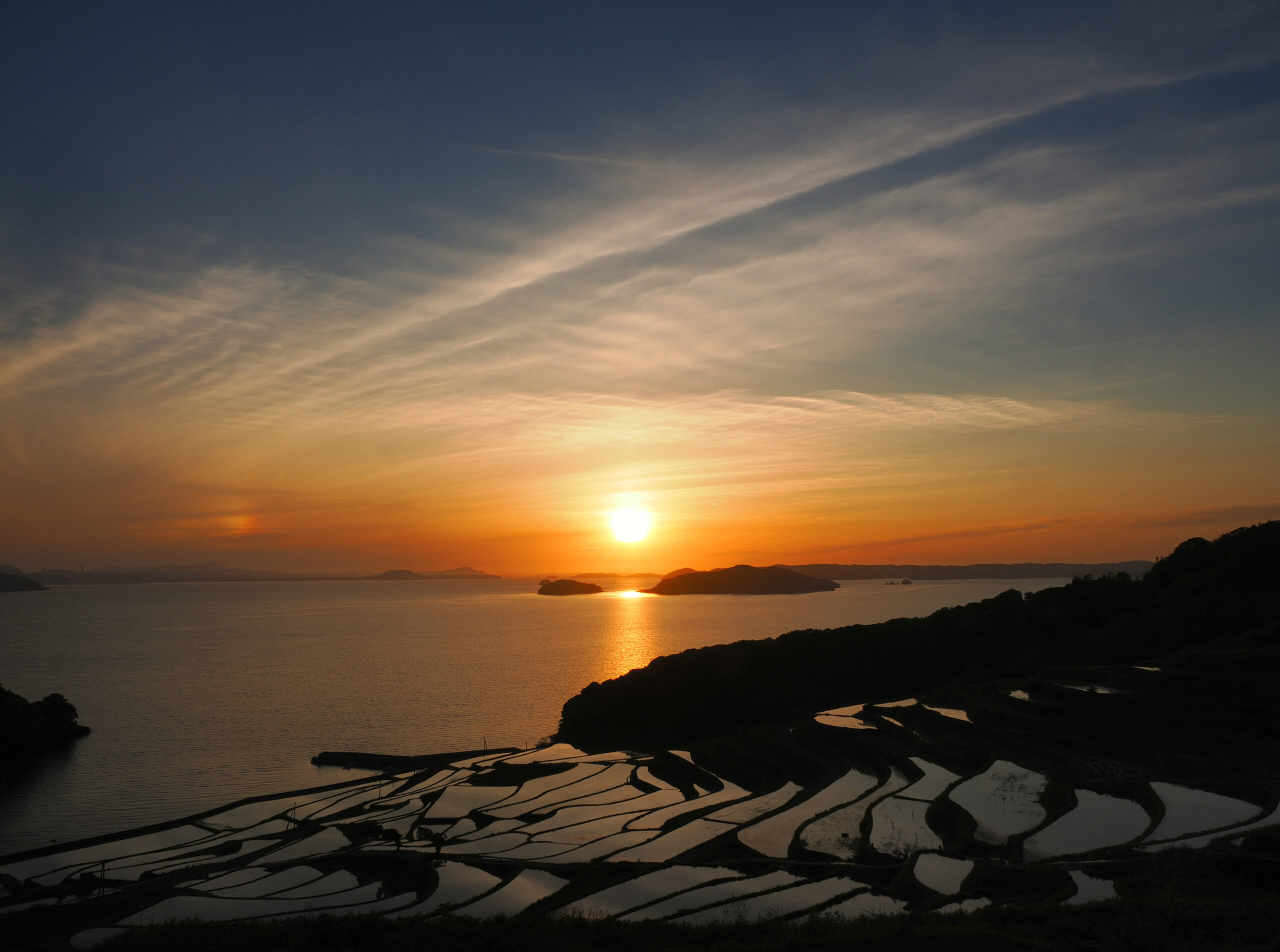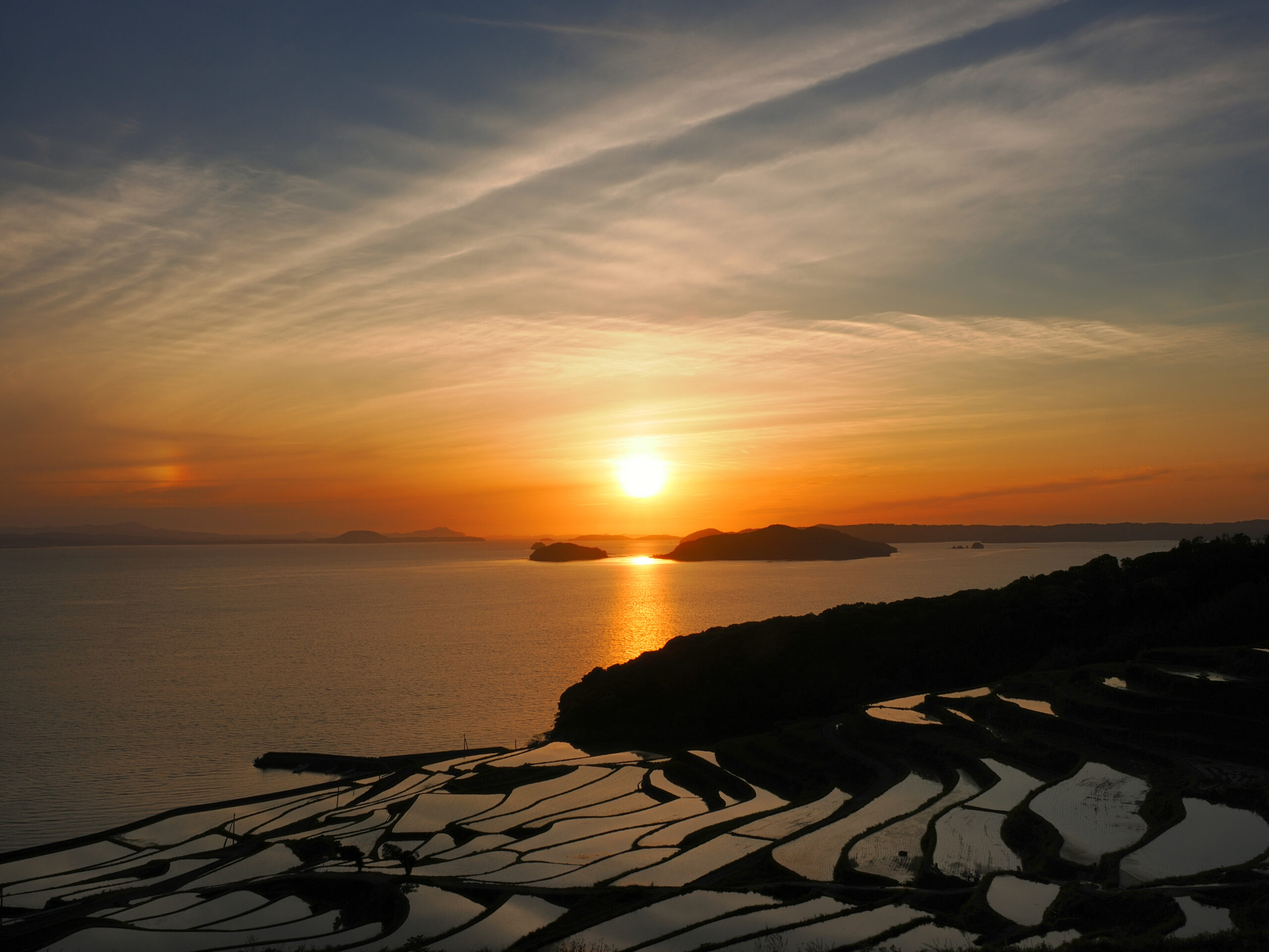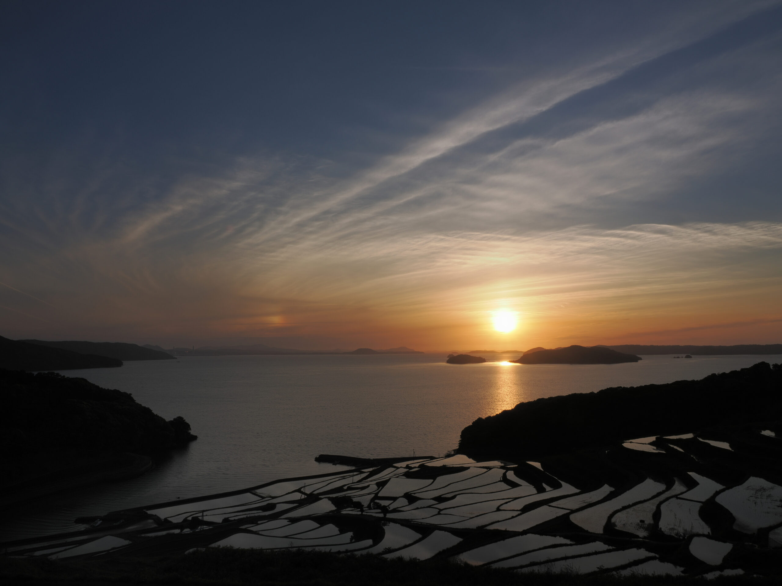 本当に美しい眺めで、写真を撮る撮らないを抜きにして癒されます。上の写真ですが、彩雲を入れたいが為、左下に余計な岬が写りこんでいます・・・棚田も入れたい、太陽も入れたい、彩雲も入れたい、雲も入れたい・・・するとこうなります(^^;)