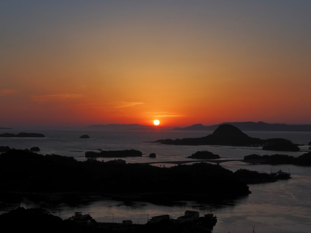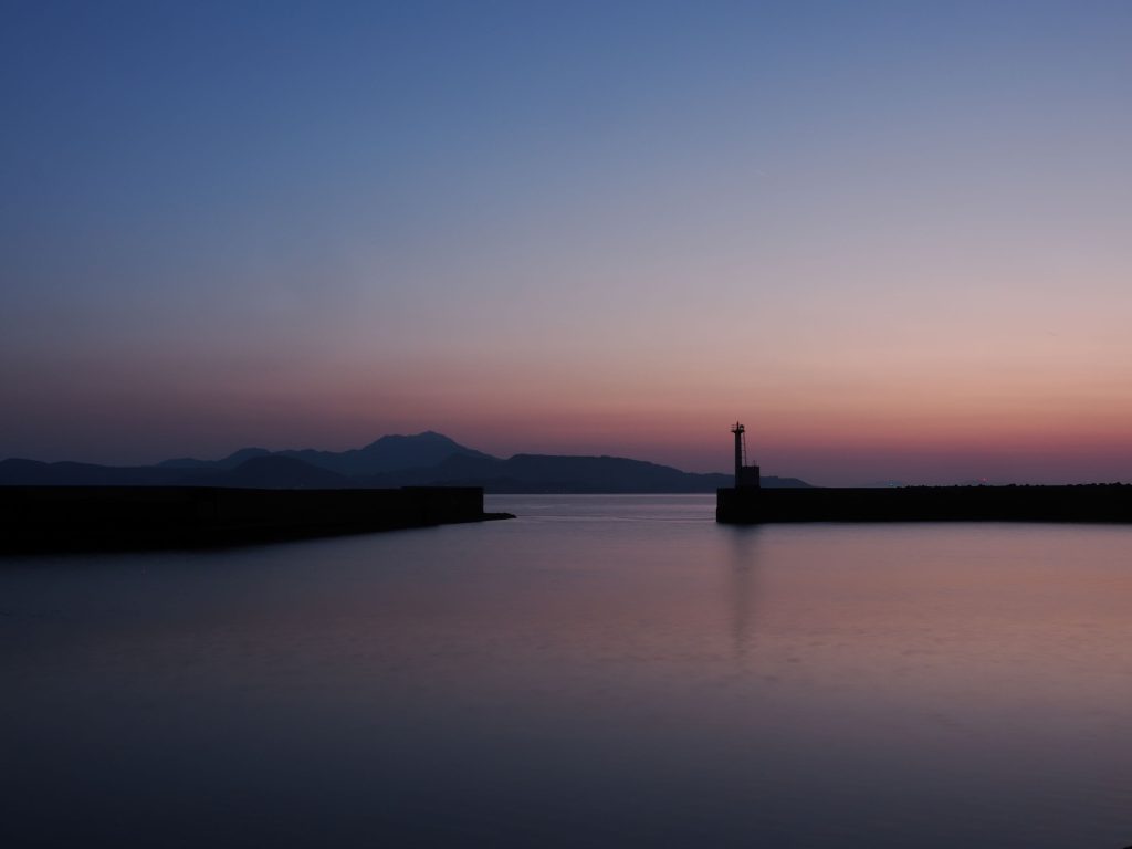 道の駅天草市イルカセンターで夜明けを迎えました。日の出は逆方向ですが、優しい朝焼け空に癒されました。